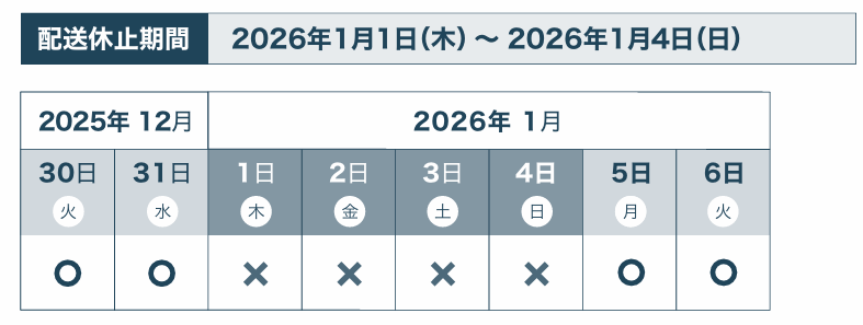 配送休止期間:2026年1月1日(水) ~ 2026年1月4日(土)上記期間は、配送日としてご指定いただけません。